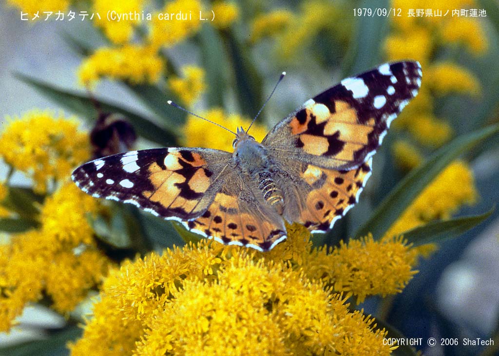 ![]() クジャクチョウ(左)と ヒメアカタテハ 79年9月 長野県山ノ内町 |