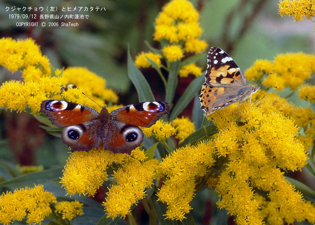 ![]() クジャクチョウ( 左)と ヒメアカタテハ 79年9月 長野県山ノ内町 |